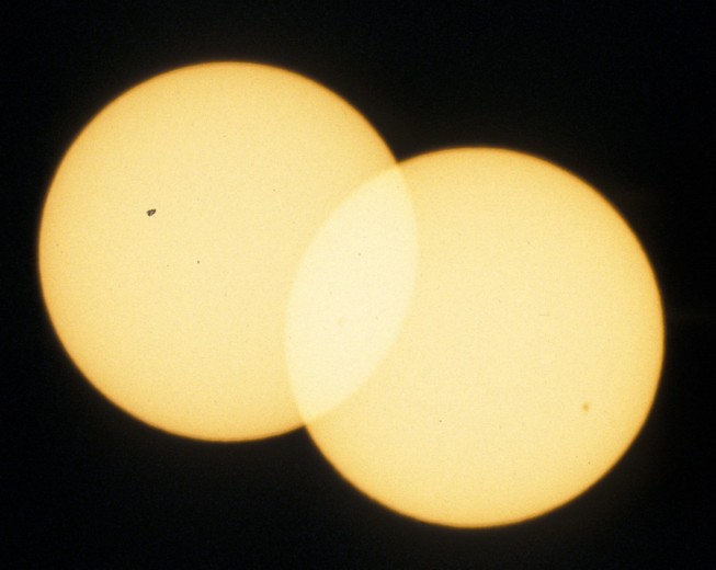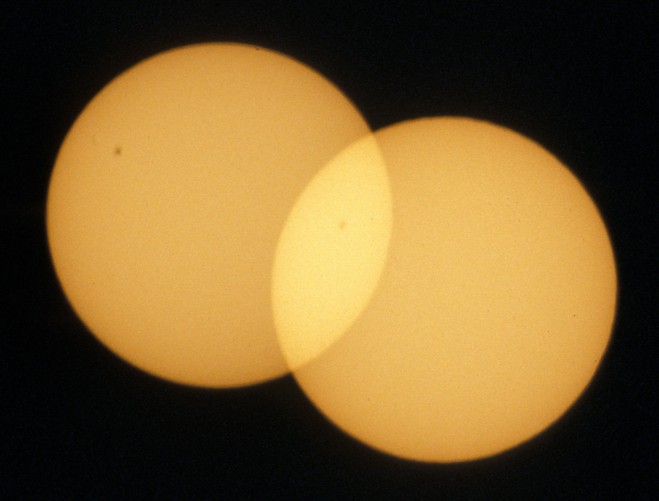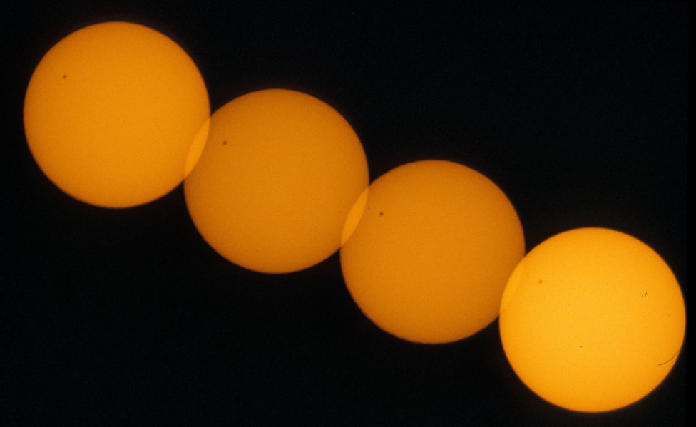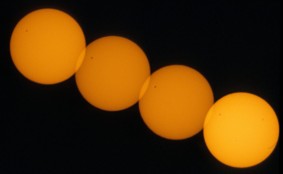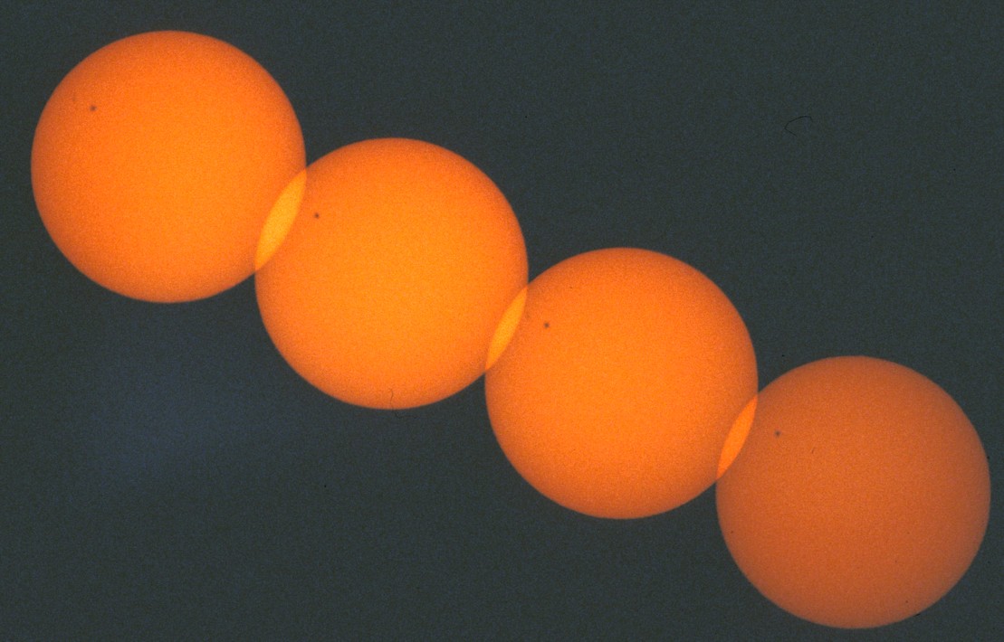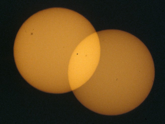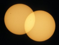 In order to be able to determine the position angle of Venus with respect to the direction to east we propose to photograph the Sun twice on each picture with fixed camera (see our project Transit of Mercury). Precondition of this procedure is, of course, that the size of the picture is large enough for more than one Sun. The smaller the Sun's face is compared with the size of the picture the longer can the time intervall be chosen and the more exactly can the orientation of the picture be determined.